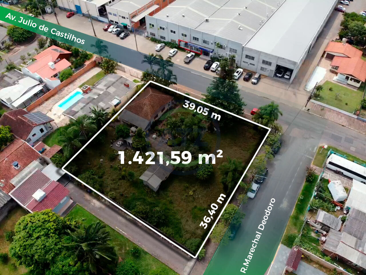 Possui 1.421,59m² de área, esquina com Av. Júlio de Castilhos e Rua Marechal Deodoro.